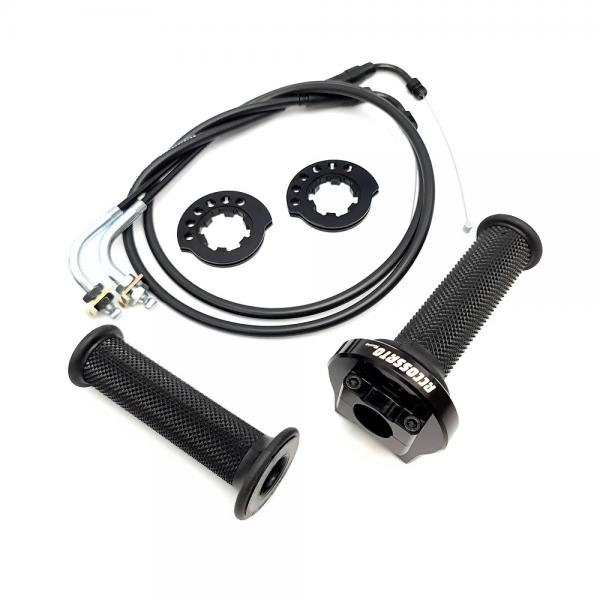 Lieferumfang: Kurzhubgasgriff Kit mit Kabeln und wahlweise schwarzen Racing Griffen (links und rechts) oder Progrip Racing Griffen mit Accossato Logo. Der Durchmesser der verschiedenen Übersetzungsrädern ist 40 / 43 / 45 mm.